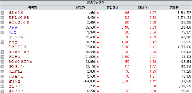 6일 제약바이오 업종 시세. (제공=KG제로인 엠피닥터)
