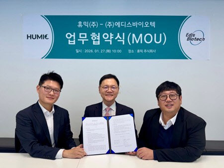 휴믹은 지난 27일 에디스바이오텍과 업무협약(MOU)을 체결했다고 28일 밝혔다. 이번 MOU는 ADC 항암제의 암관련섬유아세포(CAF·Cancer-Associated Fibroblast) 기반 종양미세환경(TME·tumor microenvironment) 변화 분석 등 양사 간 협력 방안을 모색하기 위한 것이다.
