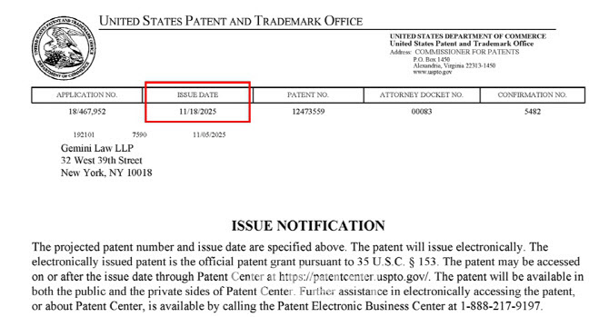 | | 툴젠이 수령한 특허 등록 통지서. 오는 11월 18일부터 효력이 발생된다고 쓰여있으며 특허 등록번호도 부여받았다. (자료=USPTO) |