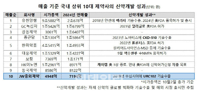 JW중외제약은 연 매출 기준 국내 상위 10대 제약사 순위에서 빠지지 않는 곳이지만 시장에서 보는 가치는 실적에 미치지 못하는 수준이다. 지난해 JW중외제약의 연 매출은 7194억원으로 9위인 동국제약의 89% 수준인데, 시총은 동국제약의 58%에 불과하다.