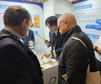 | | 엘앤케이바이오가 유로스파인 2025 참가해 척추 관련 병원 의료진에게 제품을 설명하고 있다. (사진=엘앤케이바이오) |