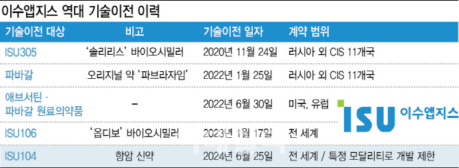 ISU104의 경우 지난해 이수앱지스와 기술이전 딜을 맺은 미국 파트너사가 ISU104를 자사 모달리티에 적용한 신약후보물질 도출을 마치고 연내 1상 임상시험계획(IND)을 제출한다는 목표다.